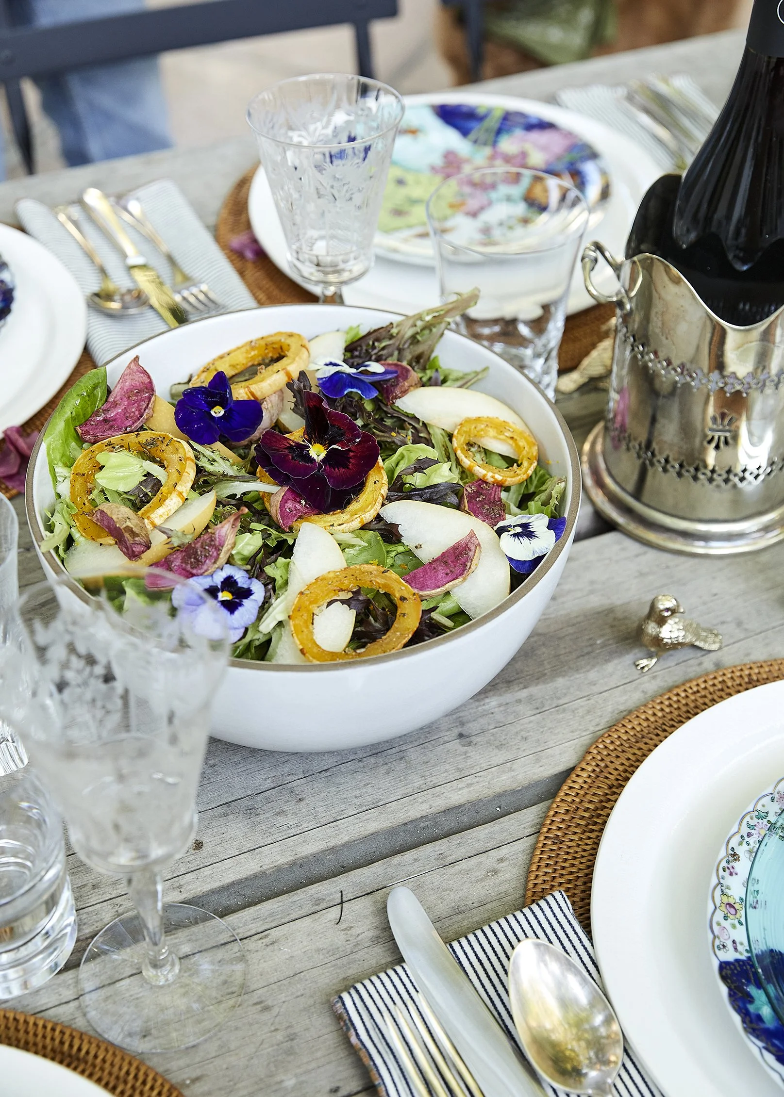 The loveliest collaborative salad with herb roasted delicata squash and watermelon radishes, pansies (not just pretty but edible too), pears, and local greens from Kenter Canyon Farms, and a homemade dressing with New Mexico Pinon apple cider vinegar, Ojai pixie olive oil, maple syrup, honey, various herbs and sea salt.