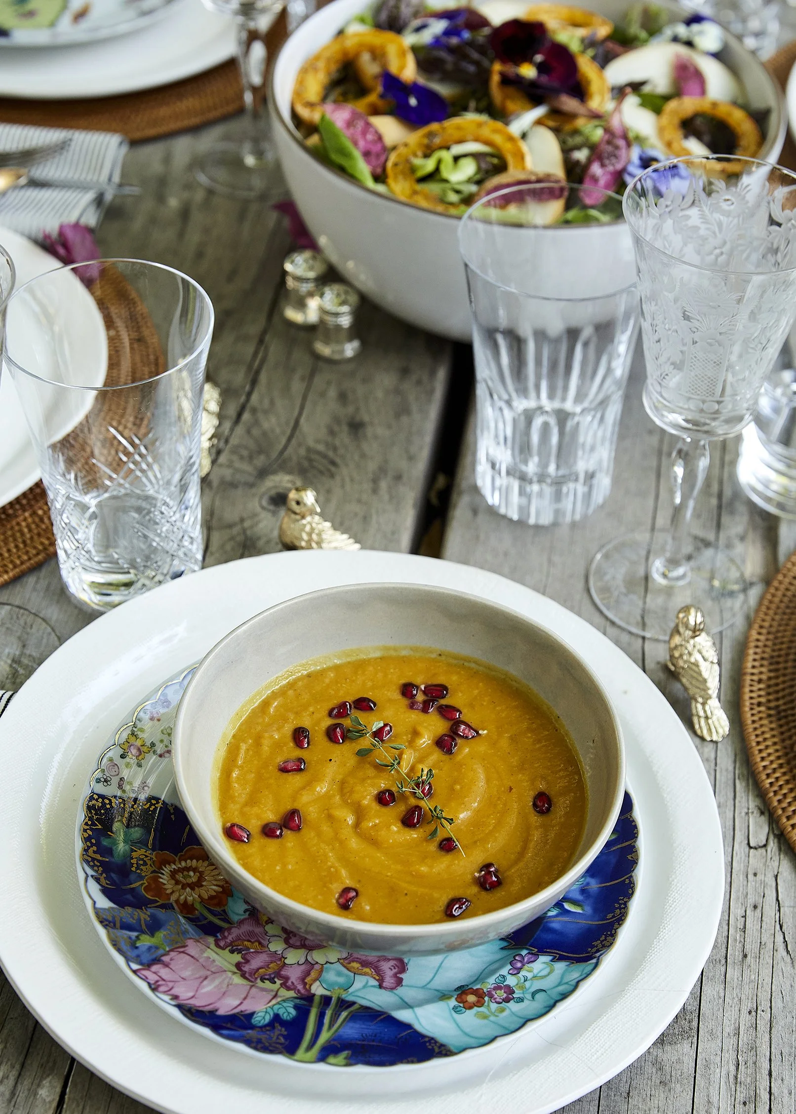 One of my famous AIP / Paleo friendly butternut persimmon puree soups made with a homemade bone broth base, celeriac, butternut squash, persimmons, shallots, garlic, fresh squeezed orange, and lots of fresh herbs - and of course my favorite Erewhon black garlic sea salt and lemon sea salt, topped with fresh thyme and pomegranate seeds.